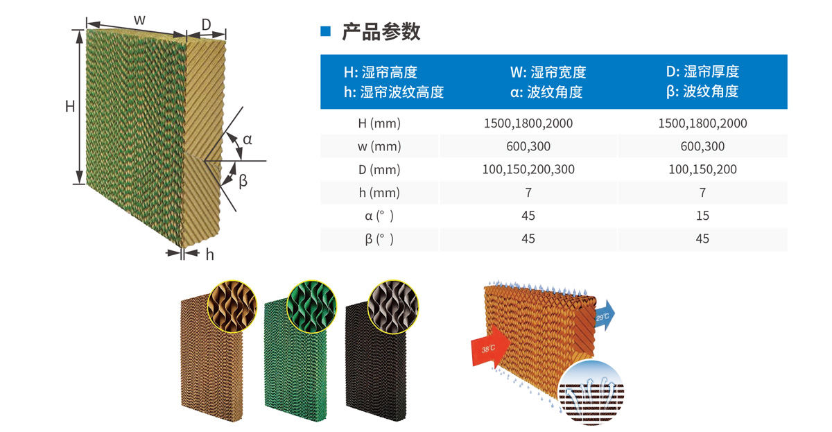 在自然界水份蒸發會降低溫度;濕簾在波紋狀的纖維紙表面有層薄薄的水膜,當室外干熱空氣被風機吸抽穿過紙墊時,水膜上的水會吸收空氣中的熱量進而蒸發成為水蒸汽,這樣經過處理后的涼爽濕潤的空氣就進入室內了.濕簾降溫原理正是利用了風機與濕簾的有效組合人為再現了自然界水份蒸發降溫這一物理現象達到降溫目的。
